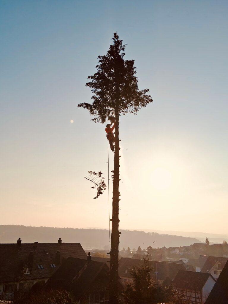 Baumfällung im Wohnquartier: kein Platz für freien Fall, Häuser rundherum, gepflegter Garten. Nicht die einfachste Ausgangslage für eine Baumfällung, aber genau dann braucht es jemanden mit Steigeisen, Klettergurt und dem richtigen Know-how.